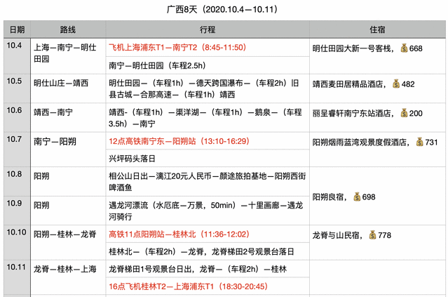 国庆期间,龙脊梯田和阳朔的住宿、租车相对价格更高,所以我们先去崇左、靖西,消费稍微低一点。
