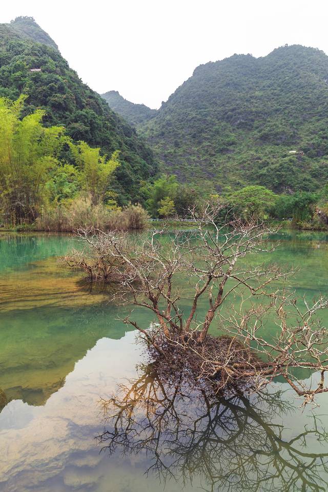 乍一看的时候,有点“低配版”九寨沟的味道,因为泉水的颜色是青色的,非常清澈,泉中立着几棵枯树枝,倒映在水里。