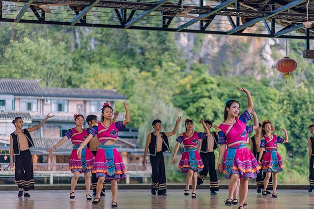 于是我们只好在棚下躲雨,正巧17点的壮族民俗表演开始了。表演的都是一些年纪不大的男生女生,陆续展示了男女生互生情愫的场景,还有栩栩如生的大鹏展示,全程大概半小时。