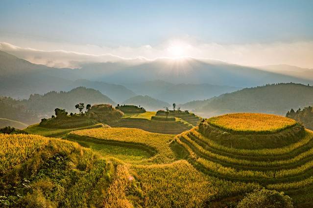 在日出晨雾中,梯田像是蒙上了一层面纱,更加惹人怜爱。