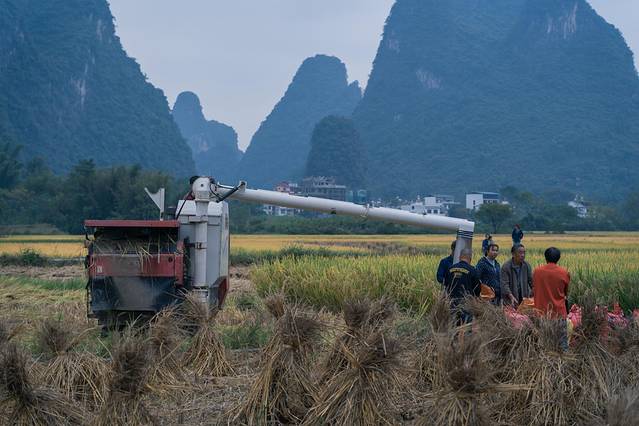 运气不错,这里的水稻今天就在收割了,再晚来一天,就光秃秃不好看了。