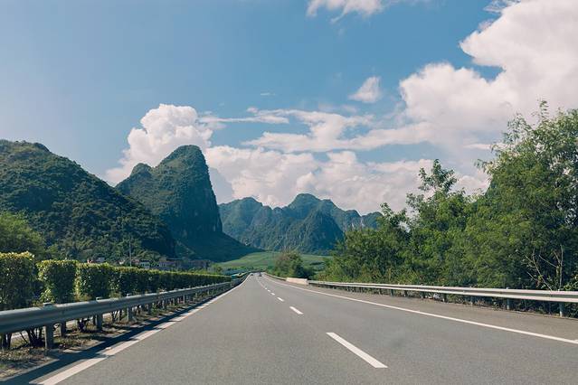 南宁的天气非常好,行驶在广西“最美高速”合那高速上,一路都是蓝天白云,路的尽头是喀斯特地貌,心情也跟着明媚起来。