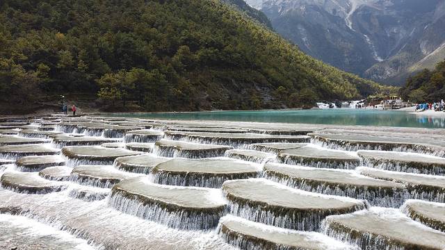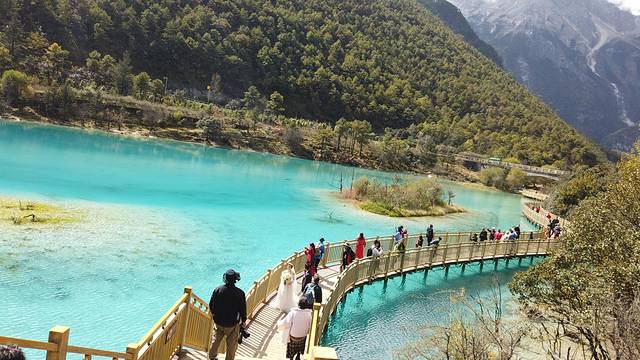 蓝月谷的湖水是雪山上的雪融化而来的,为什么这么蓝不知道,但是是云南看了这么多湖里最好看的,云杉坪是片草坪。没来得及去,就只把蓝月谷看了,到处都是拍婚纱照的。
