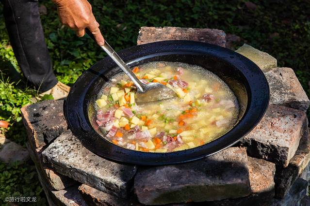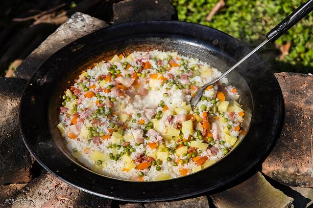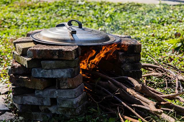 在梅花洲的烧烤区,我体验了一次自己做野米饭。做野米饭的灶台是用砖头所构建成,生火的方式也是取材生火,很好的还原了最为原始的做饭工具。这样的做饭形势也在我们的生活中慢慢的消失了。在这样一个地方很适合野炊,野米饭的制作过程也较为的简单,我最享受的过程便是生火加柴的环节,这样记忆带入了曾经的时光里。野米饭里有咸肉,豌豆,玉米,胡萝卜等,这些放在米中一起煮,口味十分的香甜和松软,令人回味无穷。