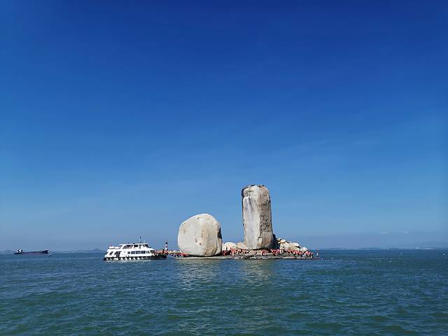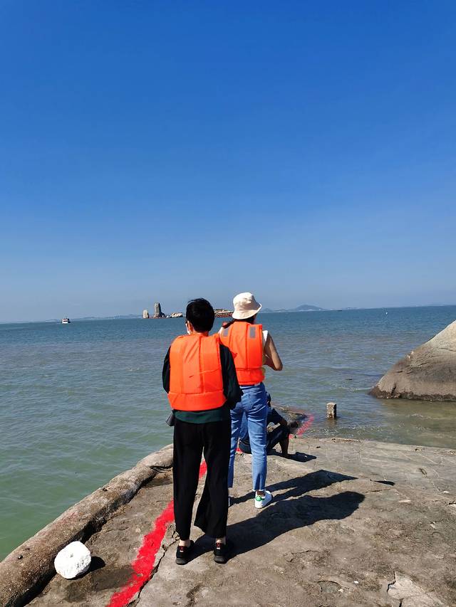从平潭县城回福州的路上,推荐顺道去看下石牌洋景区。石牌洋在平潭岛西北看澳村西侧500多米的海面,远远望去有一个大礁石托着一高一低的两块碑形海蚀柱,像一艘大船和两面鼓起的双帆,石柱又称为“半洋石帆”和“双帆石”。东侧的一个高达33米,西侧的一个高17米。从看澳村岸边坐渡船,十几分钟就到达礁石上。据地质学家考证,石牌洋是世界上最大的花岗岩球状风化海蚀柱。