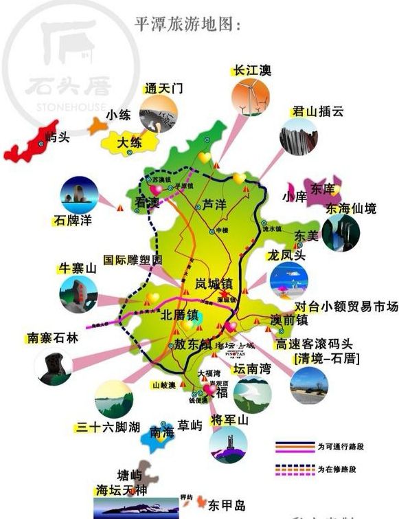 平潭岛不大,大概景点就是如图了,如果不选国庆这样的节假日,租个车,三四天可以悠哉悠哉看完整个岛,慢慢游挺舒服的。