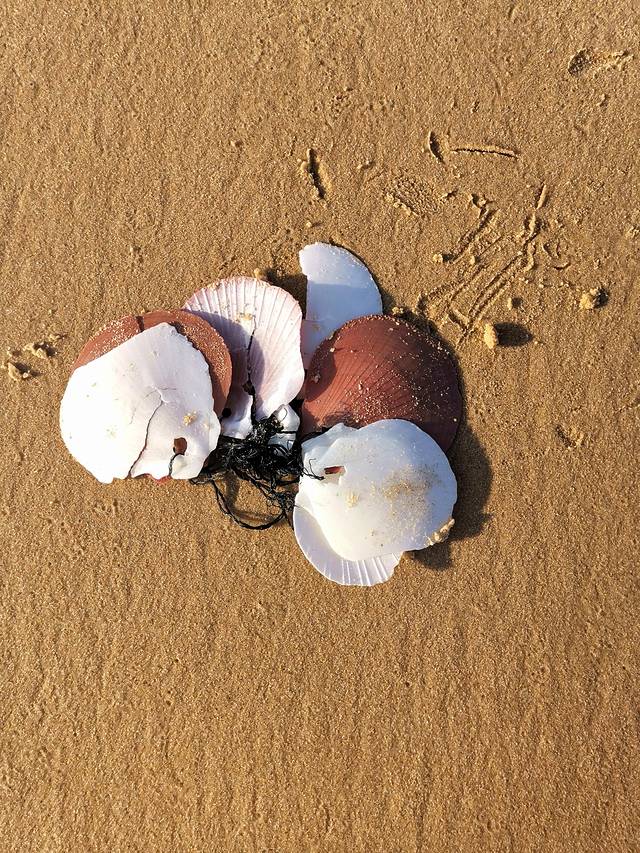 沙滩上还有很多成串的贝壳,还蛮漂亮的。