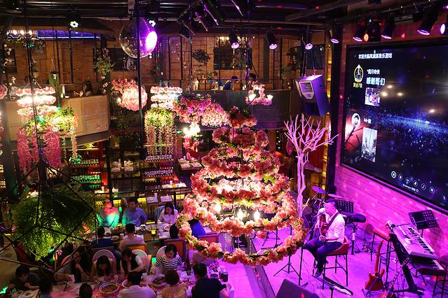 凤浦溪音乐酒馆位于街区B区,独栋两层楼,还有露台,以8090后的青春回忆为主题。整个店将餐厅,酒吧融为一体,推门而入,幽暗的灯光便将你与外部世界慢慢隔绝,好像误入了一个秘密花园。怀旧和现代混搭的元素,将艺术和文艺范展现得是淋漓尽致!酒馆每天有乐队现场驻唱,常驻乐队【红厂乐队】,也会不定期邀请其他歌手。ktv歌曲资源随时更新,包括民谣,流行,说唱等多种元素音乐。乐队演出时还可以点歌。人来人往的城市,这里是自成一处的小天地,或律动或慵懒,与外面的喧哗格格不入。此刻,有文艺,有酒,有故事,音乐、美酒、知己好友,所有美妙的一切都在这里等待你。