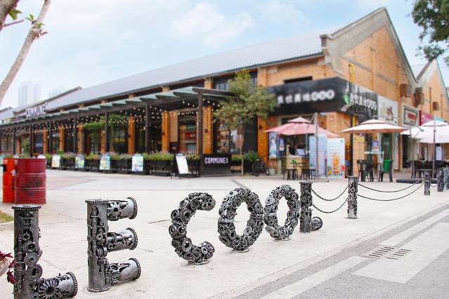 上河谷孵化器,是一个文化产业的孵化基地,为创业团队提供各种孵化服务,支持发展文化产业。门口的机械字母就是上河城的英文名,全部由大小齿轮、螺丝等旧机械零件重新组合打造而成,表达了街区曾经在工业时代的辉煌,也象征着街区重新改造后赋予老建筑新的生命光彩。在上河谷孵化器外还有两个红色的圆形雕塑,似球又似蛋,寓意孵化,破壳而出、破茧成蝶,街区未来一定会更加美好。