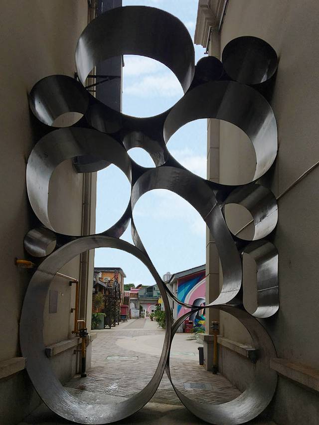 在涂鸦广场旁边,有一面钢圈打造的泡泡墙,这面墙仿佛一个时光穿梭之门,将街区与外界隔绝开,进则别有洞天,出则繁华现代。