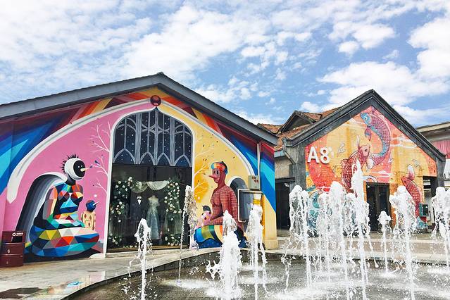 水塔涂鸦是街区的标志性建筑,水塔高35米,是可查到的世界上最高的圆柱体涂鸦,个性张扬、色彩鲜明的涂鸦与红砖墙旧厂房建筑形成鲜明对比,时尚与传统的碰撞,让整个街区充满艺术感与个性。水塔原有的5扇窗子设计成5个鸟笼,画面上有一只猫头鹰叼着金钥匙,要去解放它的同类。图画上鸟笼、脚镣、钥匙等元素,就是要鼓励时下的年轻人思维上不要受到束缚,应该带着创造性去释放自己。