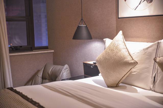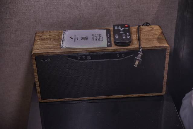 最让人惊喜的,是这里居然还设置了一个小小的音乐空间,CAV蓝牙音响就放置在床头,插上电源连上手机,可以选择自己喜欢的歌,床头三面环绕,播放音乐时能营造出很好的立体环绕音,旅游晚上还能悠闲地躺在床上,放上几首抒情的爵士乐,享受低频带来不一样的音乐体验,实属难得。