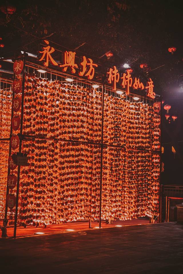 坊内尽是各种 陕西 的特色美食、特产,以及旅游纪念品,恰逢柿子丰收的季节,柿子满挂成墙,鲜艳夺目,据说这个柿子墙的柿子一共有15吨,都是从 陕西 富平 采摘运送到此处,它们终将被晒成柿饼,游客可以加入体验削柿子皮,遇到晒好的柿子游客也可以品尝得到,这个创意主题也太有新意了,互动感和参与感满满。