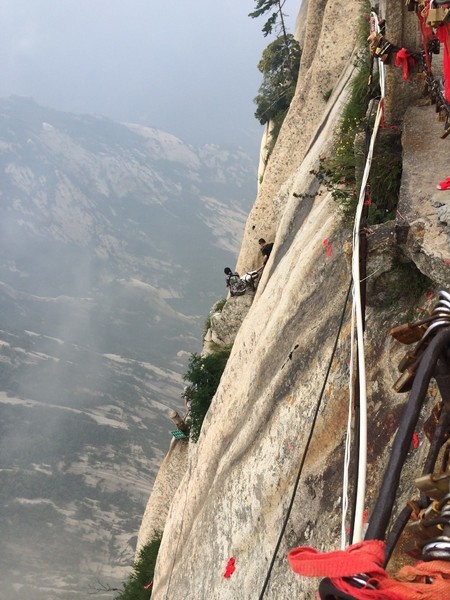 马不停蹄来到了北峰,俯瞰苍龙岭,景色真是让人觉得十分流连忘返。接下来就是重头戏,最惊险的长空栈道了,大家井然有序,生怕自己每走一步会失误解错安全扣子,真是刺激。最怕的就是在栈道原路回去,因为栈道木板的宽度相当于两人脚的宽度,望望脚下的悬崖,假装镇定继续走。