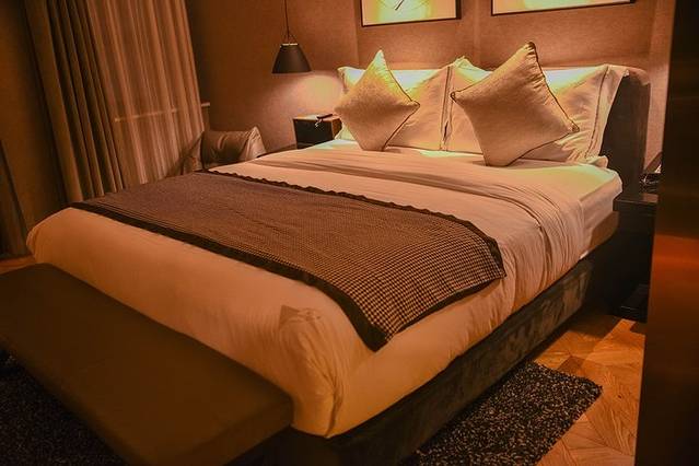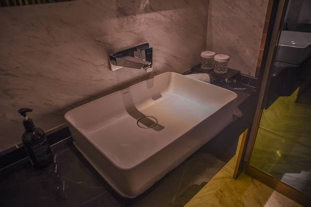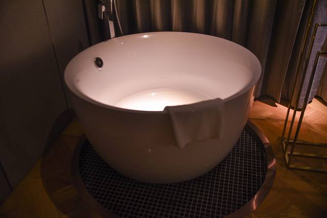 深色家具沉稳大气,白色系的浴缸、床铺和挂画为整个空间增添了一抹活泼清新的气息,黑白云石为基调的洗浴间更显高级,目及之处干净明亮,绝对符合高级酒店的水准。