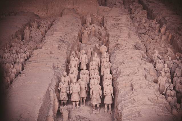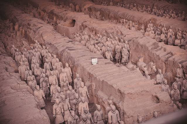 一号坑是三个秦俑坑中最大的一个,出土了2000多件陶俑和陶马,虽然只能站在四周俯瞰坑中陶俑,但也足以让人震撼,那独一无二的气势,将我瞬间拉回千年之前,仿佛千军万马在耳边咆哮。出土的兵马俑分为士兵与军吏,军吏又分有低级、中级、高级,士兵则包括了步兵、骑兵、车兵几类。