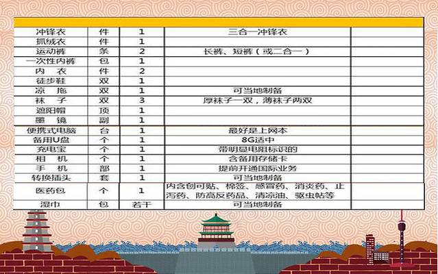 西安 秋冬时期的温差都比较大,所以记得要注意保暖,特别是下雨时期的 西安 就会变得更加寒冷,所以在 西安 旅行需要注意多带点衣服,这样就可以减少感冒的几率,以下就是物品清单表,可根据自己的需要进行勾选。