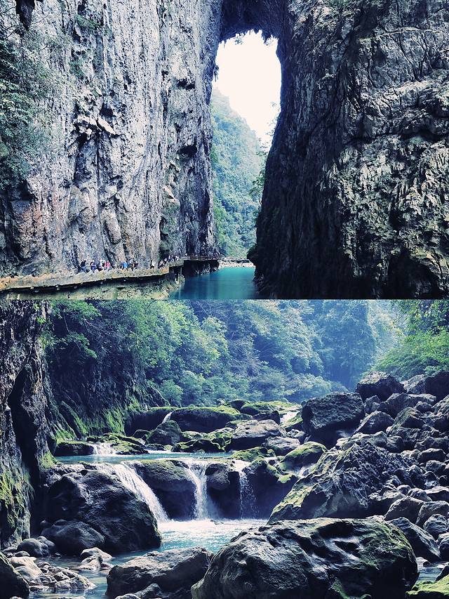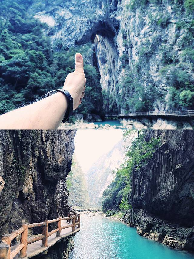 沿着峭壁边的栈道一路蜿蜒前行大约一公里左右,就能看到一座天然的巨岩,仿佛一座凯旋门一样,这就是大七孔的喀斯特地貌奇观—天生桥,有点像重庆武隆天坑的天生桥,当然我觉得更像一个竖起的大拇指。一条溪水缓缓从中穿过,碧水幽幽令人遐思,当然如果仔细看,你还能在崖壁上看到古人留下的步梯呦。