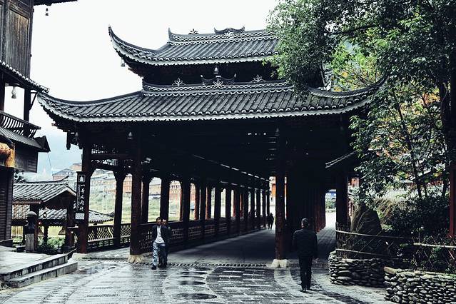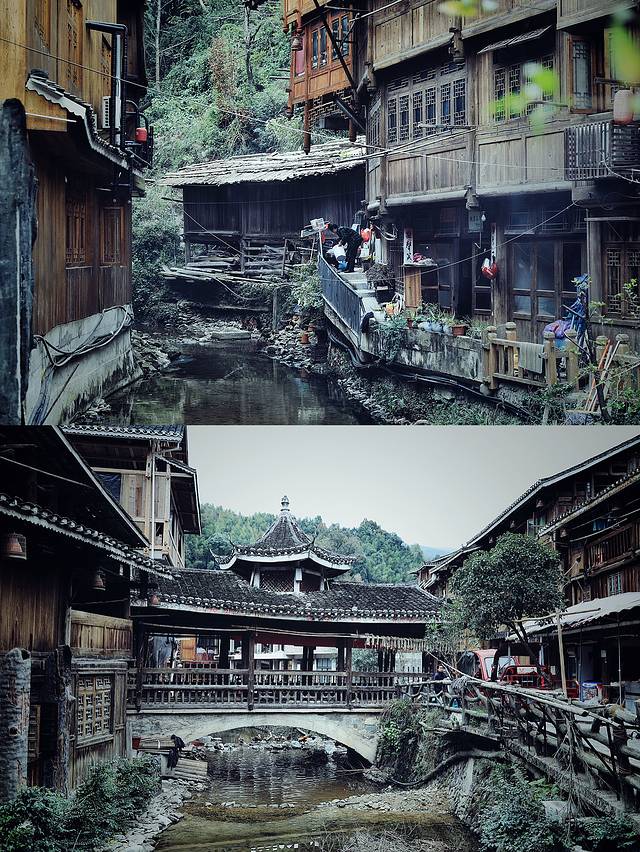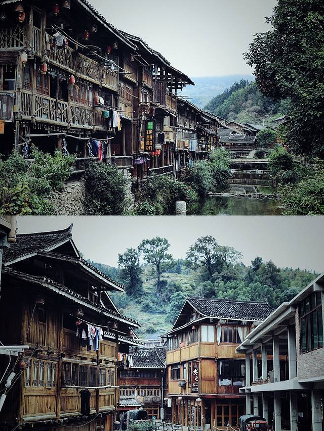 寨中的房屋大多为干栏式吊脚楼,沿河而建鳞次栉比,房屋大都采用杉木建造,硬山顶覆小青瓦,古朴实用,从空中俯瞰,错落有致。不过近些年随着旅游业开发,寨子中也越来越现代化,尤其是民宿业的大兴,一些老房都进行了改造,不过如果你走进一条条小巷中,还是依旧能感受到吊脚楼的独特魅力