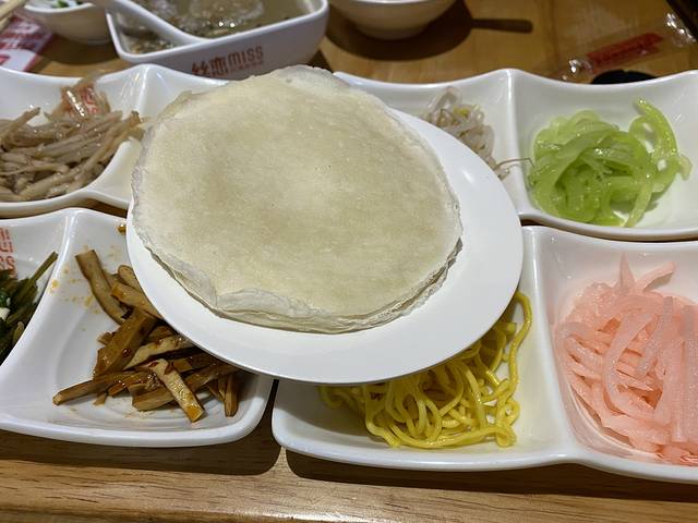 不过呢,这个“襁褓”其实是用大米面粉烙成的薄饼,薄如纸却有手掌大小,摊开之后可以卷入萝卜丝、折耳根、海带丝、炸黄豆、脆哨等十几二十种配菜,然后再注入酸酸辣辣的汁液也就是蘸水,吃上一口素菜脆嫩酸辣爽口,开胃健脾,好吃极了