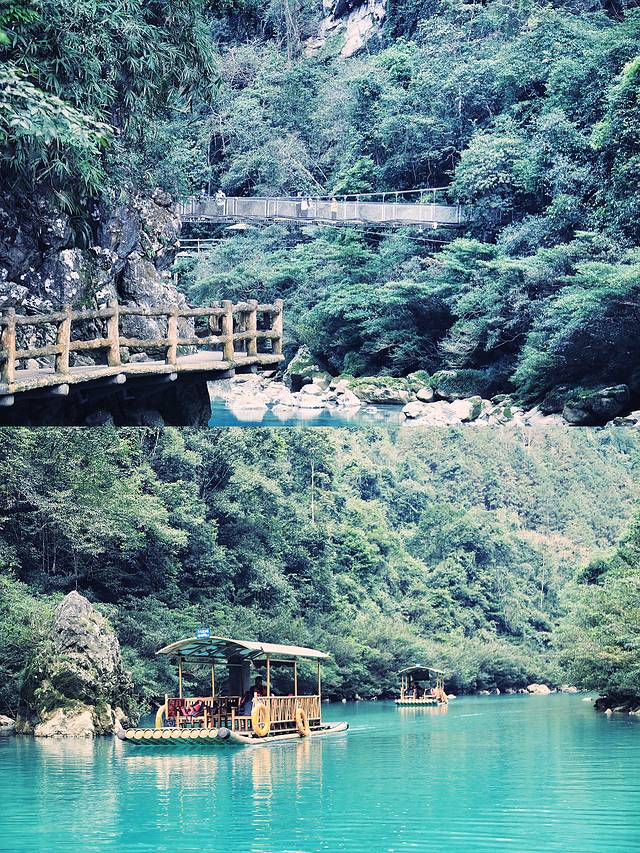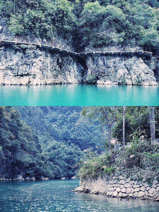 游船一路破水前行,置身山水间突然想吟诗一句“两岸猿声啼不住,轻舟已过万重山”,当然也有很多游客选择沿着栈道步行,其实不管哪种方式都挺好的。小船穿过悠长的峡谷很快就到了山谷中的码头,下船之后沿着蜿蜒的栈道前行,一侧是峭壁,一侧是峡谷浅滩,曲径通幽绿意盎然,峭壁的岩石上不时还会有滴水渗出,光影变幻,恍惚间有了一种探险的错觉
