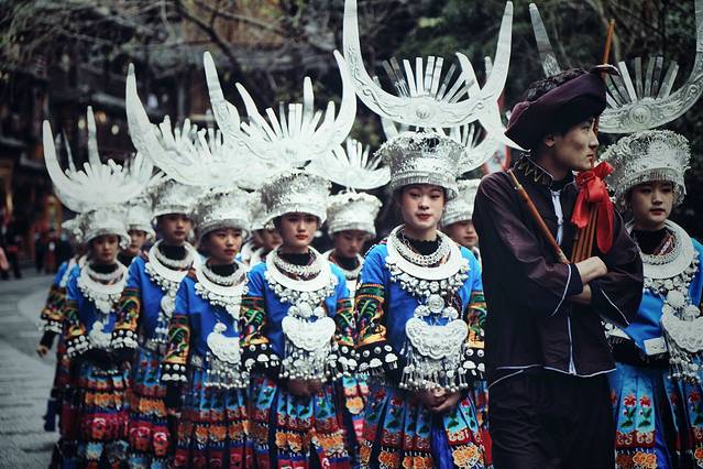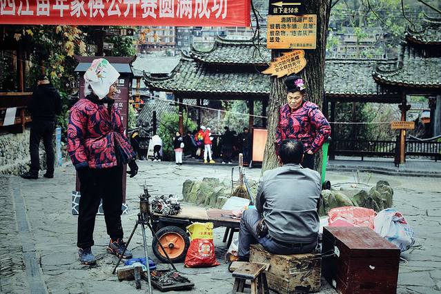 观光车风驰电掣在路上疾驰,很快就到站了,下得车来漫步在略显商业化的街道中,但是感觉和大部分的商业步行街相似,只是多了一些苗族元素而已,尤其是走到哪里都能看到身着苗装的女子以及满街的苗服租赁店,但这并不是我所期待的苗年氛围,难道再次错过了热闹的苗年么?