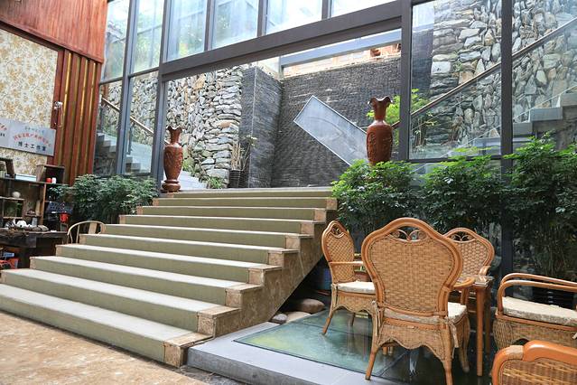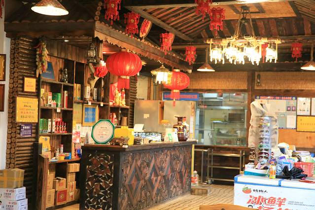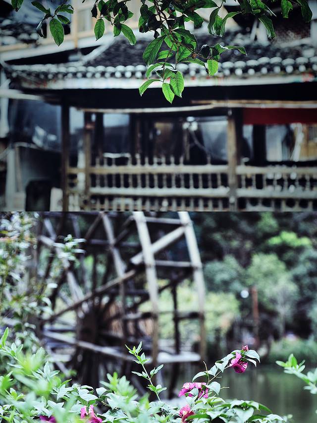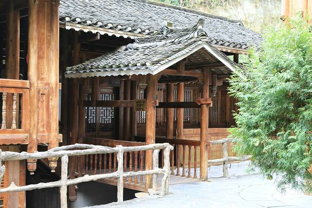 沿路来到寨中一处水池,池水中有一只铜牛雕像,形单影只不知道在等待这谁,不远处就是寨子的一处广场,应该是进行民俗表演的地方,只是可惜此时除了广场四周几家店铺里的主人外,就只有我傻傻的站在这里不知所措了,好在这里也是民俗陈列馆的所在地,到屋子里看看也不错,从陈列馆向外推开门,放眼望去,青砖灰瓦吊脚楼,如诗如画一般