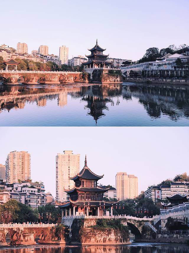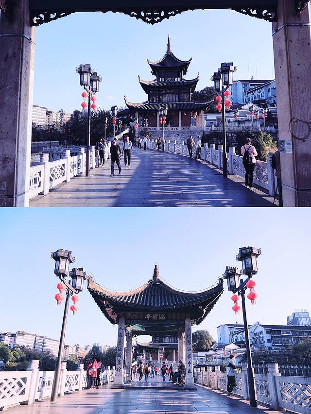甲秀楼绝对算是贵阳的另一个标志性建筑,但凡去贵阳旅行游玩的人,大多都要去看看,这是一座上下三层的小楼,如果不特意告诉你,有可能都会被错过,它安静的卧于南明河之中的一块巨型基石之上,南明河从小楼前缓缓流过,汇为涵碧潭,楼侧由石拱桥连接两岸,桥上有小亭一座,名曰“涵碧亭”,亭前游客如织穿梭不断,游客大多会停下脚步,凭栏观望或者驻足拍照。走过连接甲秀楼的石拱桥,就能看到翠微园,园内亭台水榭,颇有江南之风,有兴趣的可以取参观一下