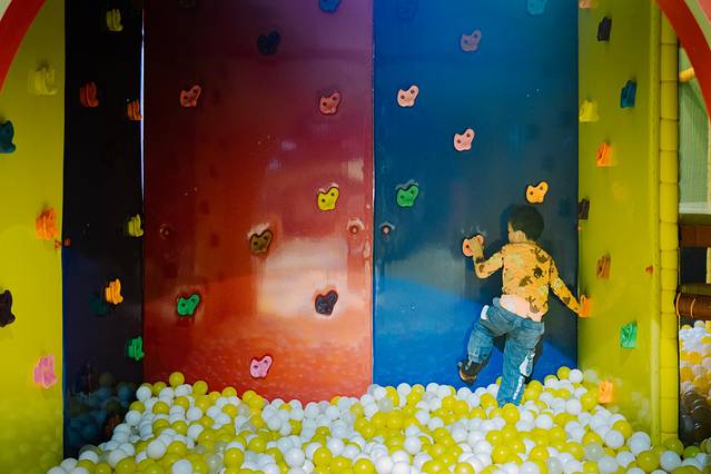 在一楼滑梯的热身后,脱缰的野马已经安耐不住激动的心情,拉着我的手往里冲。这里的淘气堡像城堡一般,搭配着黄色的海洋球,仿佛坠入了梦的海洋。