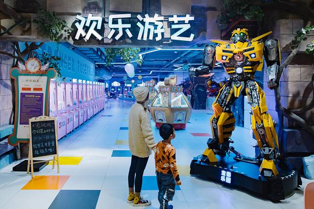 在二楼的电玩区适合相对大些的孩子,这块区域碰碰车是免费的,其它项目额外收费,不需要充值,直接扫码就可以玩每一个项目。 狍哥被门口的变形金刚吸引住了。快进去一探究竟吧~