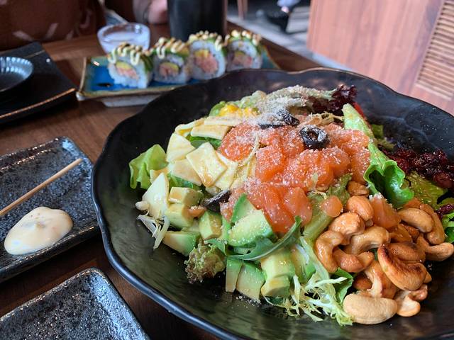 「三文鱼牛油果蔬菜沙拉」超级超级好看,端上来的时候被它的色彩搭配美到了,因为点了很多烤串,清爽的沙拉成了本场的宠儿。