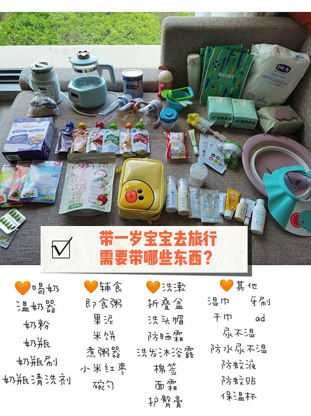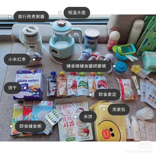 由于是第一次出远门,我嫲的行李原则是非必要就不带,但吃喝基本参照家里的配置。所以不仅给我带了烧水壶,还专门买了便携式煮粥神器。两罐400G奶粉和六包即食辅食(我的最爱),具体需要准备的东西参考我嫲的图。