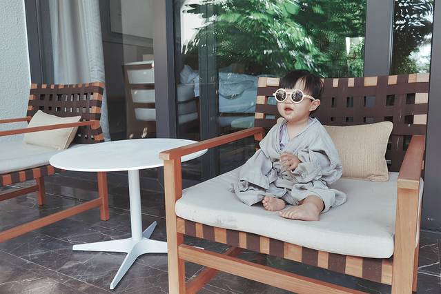 办好入住,我们就回房间了。一进门,又是一串哇。我们的房间是有海景的,阿姨好高兴,说第一次看海就可以看个够。而且我发现楼下就是我最喜欢的滑梯,还有好几个,不过都是建在水里的,也不知道我嫲会不会让我去。不管了,阿姨给我喂辅食了。可能心情大好,食量都大增。