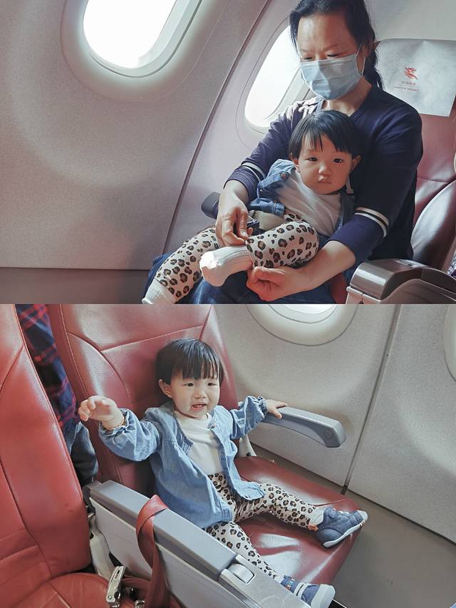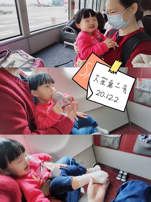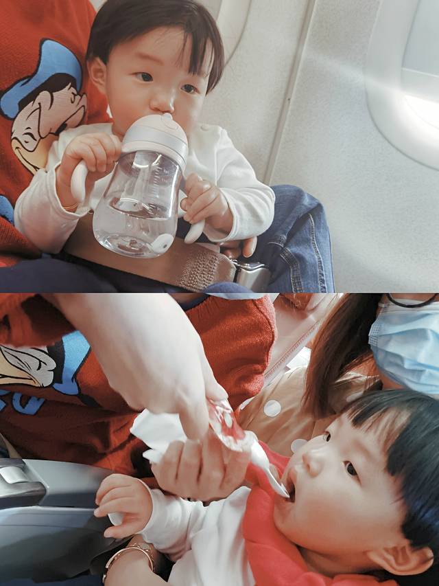6点我在睡梦中被我嫲叫醒,打车去机场。(嫲嫲坚决不要粑粑送,其实粑粑已经破天荒早起了。)6点半到机场换票,可能是看我可爱,好心的柜台小姐姐给了我们第一排的座位(这班飞机没有商务舱,有也不知道我嫲舍不舍得给我买)。过安检前先给我喝了奶,因为嫲嫲说保温瓶的水不能带。阿姨还给我带了一小罐子小米粥,是我的早餐,安检的时候主动拿出来检查,可以通过。其实回程的时候我刚好有半奶瓶奶没喝完,主动拿出来问了下安检人员,也可以通过。过了安检,我嫲去热粥,母婴室有温奶器。没的话拿个塑料袋盛水其实也行,确保不漏就行。8点左右吃完辅食,我们登机了。