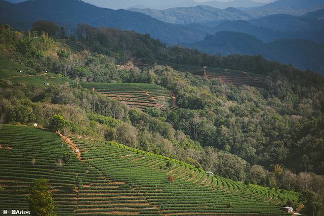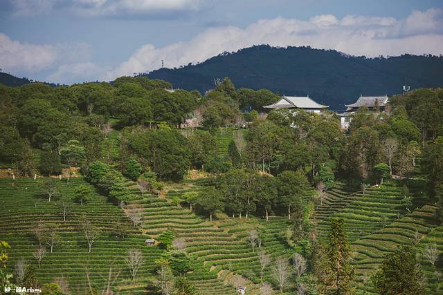 远方大片大片的茶林随着山势高低起伏,如同翻滚的海浪,与远方连绵的青山相拥,层层叠叠,仿佛在大地上奏响了一首节奏轻快的乐曲。