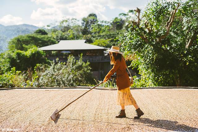 池塘边繁花盛放,有瓜有果,鸡鸭在路边上蹿下跳,晒场上是沐浴着阳光的咖啡豆,满眼都是向往生活的样子!