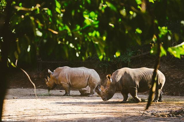 当我们上午抵达时,恰逢犀牛早餐时间,树影婆娑中,两只大家伙正在悠闲地嚼着干草。