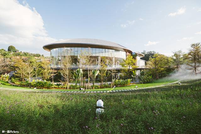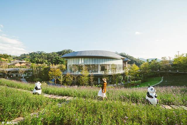 进入大门后,视野开阔起来,大面积的花海和远处的茶山交相呼应,簇拥着艺术馆一样的大厅,非常吸睛。