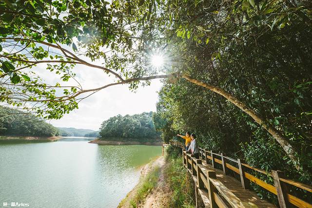 600亩超大的湖区,沿着湖畔长长的木质栈道漫步,清脆的鸟鸣从光影斑驳的林间传来,使人驻足观看、浮想联翩。