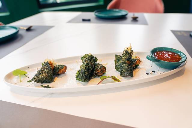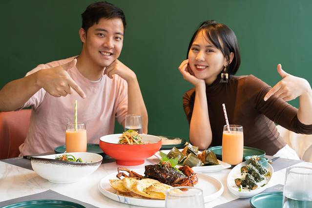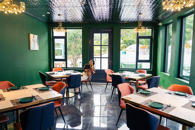 这是一家主打蟹的餐厅,主要是以私房菜为主,看了一下目前是很火的新晋网红餐厅。位于海角院子,餐厅周围打造的是雨林的感觉,所以有很多绿植围绕,也设有很多动物的小雕塑,整体的建筑都是偏向清新简洁的风格,所以用餐环境很舒服!店里是绿色很复古加上ins元素的轻奢装修和餐桌很搭配!