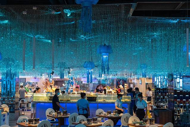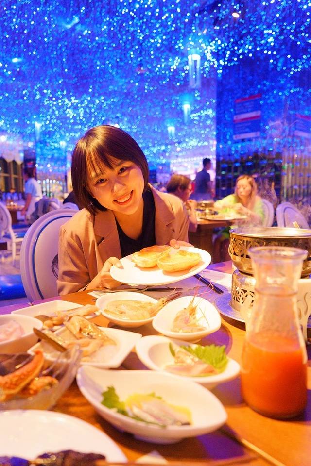 这家位于大 东海 大菠萝商场里面,窗外就是大海,可以看到超棒的高空270度景观,海景座位在这里可以有,俯瞰整个大 东海 !室内打造的很梦幻像星空一样!顶上用了很多灯管的装饰,把餐厅布置成了一个小小海洋~里面的冰雕也是动物的形状!并且取菜区和就坐的区域安排很合理,给人很舒服的感觉。