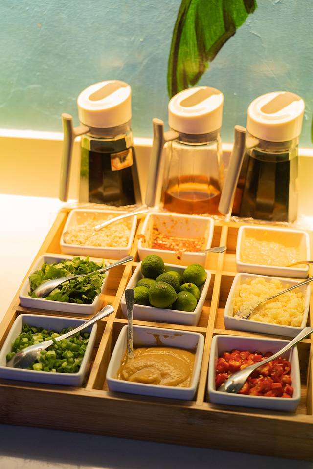 调料:可以让服务员帮你调制特色的蘸料,也有调料台可以自己去发挥,也有辣椒油和香油!一定要试试特色的调料!