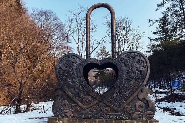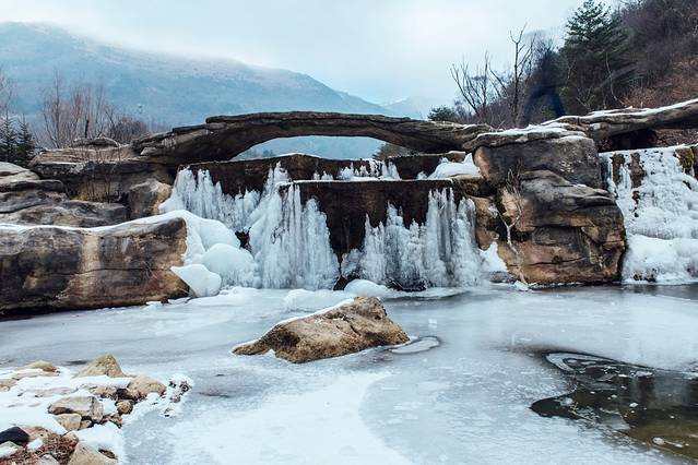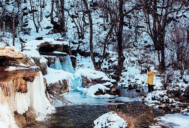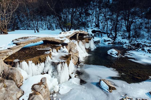 有时候,不用刻意去找景点,沿途的风景也特别的惊艳。从紫柏山出来,景区门口两百米处那个被冻住的瀑布与河流深深印入我的脑海,静止的画面充满着诗情画意,像被冻住的美好时光,令人无限的遐想。