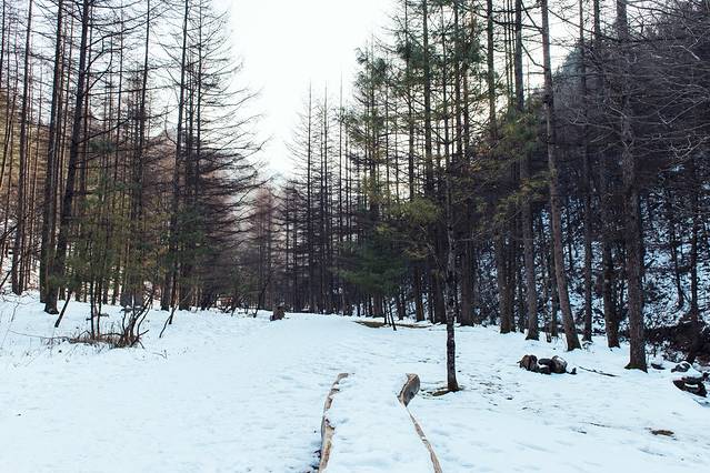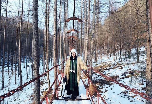 不知不觉车子就开到了情人谷,这个听名字就很浪漫的地方,谷内有五百亩落叶松,红水河流经山谷,大雪覆盖矮桥,是条非常幽静,适合漫步林海雪原的山谷。