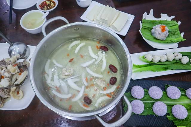 椰子鸡就在林姐香味海鲜旁边,我们去的时候已经是下午三点了,这时候店内的顾客比较少,早已饥肠辘辘的我一口气点了很多菜。服务员先给我们上了锅底,随后开了一个新鲜的椰子汁倒进锅里。涮菜点了虾滑、鲜豆腐、澳洲肥牛卷、手打牛肉丸、梅林午餐肉、时令蔬菜等,每道菜都很惊喜。
