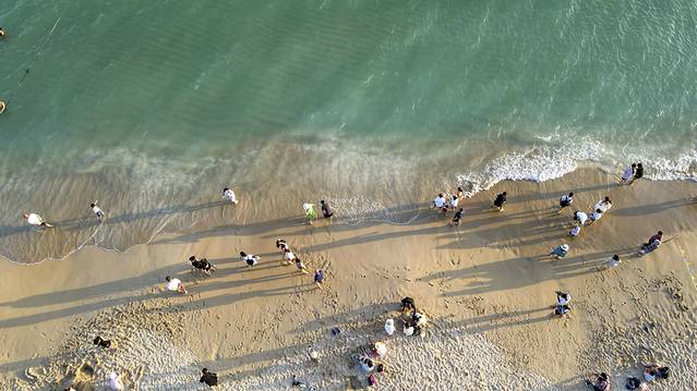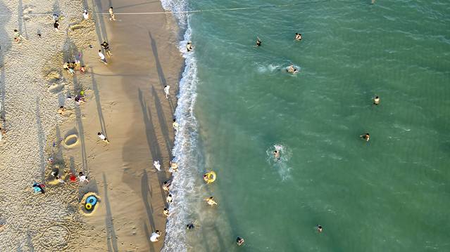 向远处望去,看着远处海天一色,听着身边游人们的欢声与乐。那份宁静而又喧闹的蔚蓝,更是给人一阵轻松的感觉。站在沙滩上,放眼望去,整个沿岸无论是沙滩上还是大海中,几乎全都是外国友人,有大人有小孩。如果不是身后安全处显眼的中文安全提示语,我都差点一度认为以为,此时此刻的我身处异国他乡。