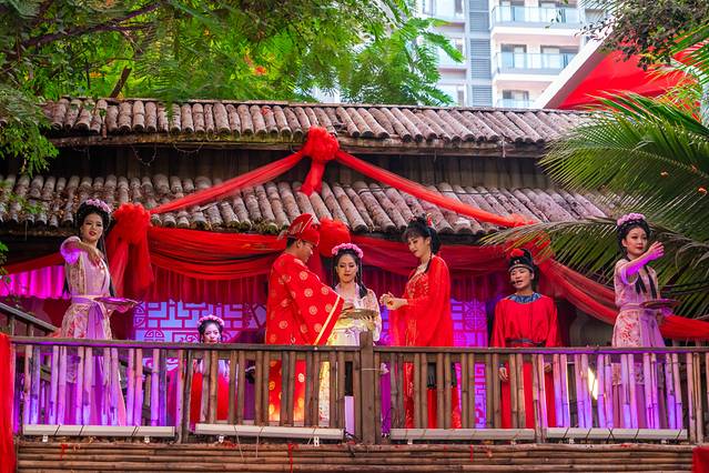 和桂林西安的不一样,桂林和西安都是上午就开门了,全天候工作时间,都有正式的演出,而三亚千古情则是下午三点才正式开门,正式演出自然也是下午才开始。我们所看的演出是下午5点的那一场,因为刚进景区,真的白天想着在景区里转一转。