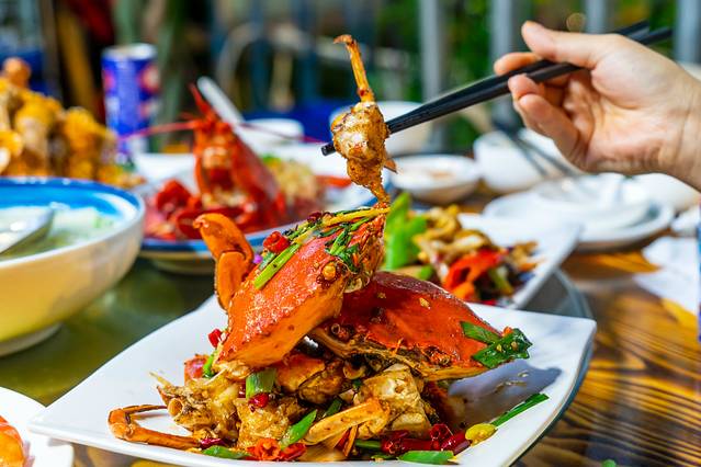 香辣蟹:螃蟹很肥,肉很多,简单的配料,香香辣辣味道非常好的融入进了螃蟹中,吃完都想缩手指头,没错了是下饭的味道!