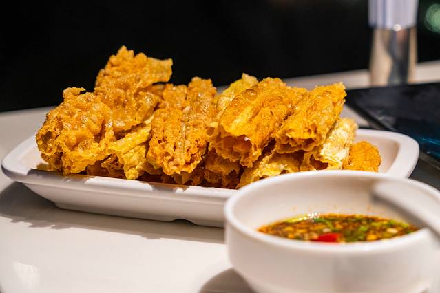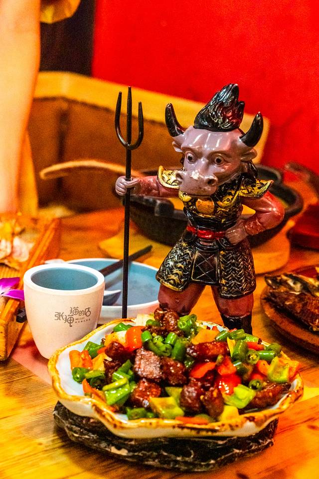 这个牛魔王摆盘真的是太有料了,他家的餐具基本上都这么豪横,这样才更符合张猫猫的店的特色。 Q弹滑嫩的五指山牛肉,切成小粒儿,搭配辣椒圈儿,微微辣很下饭。