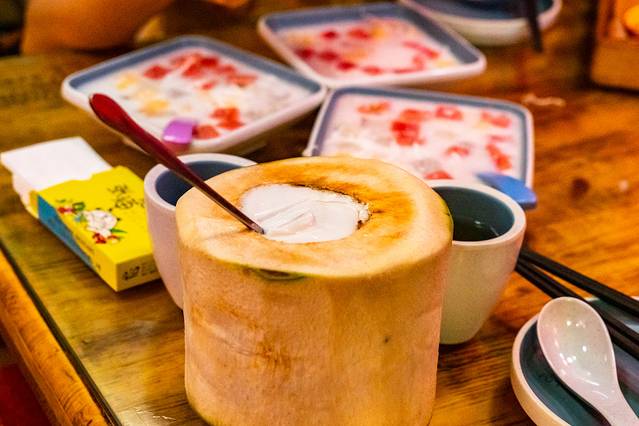菜品:古法手撕盐焗文昌鸡、五指山小黄牛肉粒、黎家冲浪鱼、传统五指山野菜、海南猪肚鸡、招牌双层椰子冻,特色椰子灰冰淇淋、招牌椰奶清补凉。